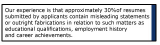Stringent Resume Verification Oversight - Our intensive research procedures yield an 30% discrepancy rate between what a candidate claims and what we find from their academic institutions. Our background specialist training program is simply the best in the business. Our staff is trained to follow our proprietary investigative techniques which provide the results you need, when you need them.Some candidates may be less than truthful about their employment history. Internal research shows this to be the number one discrepancy on resumes and job applications. Our background specialists verify the information on applicant's resume. Dates of employment, starting and ending positions and salaries, reason for termination, and eligibility for re-
